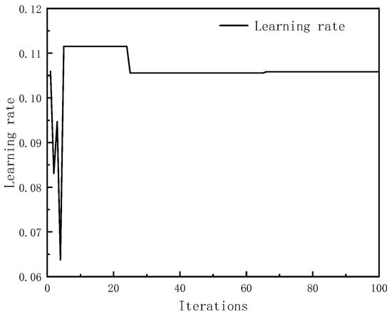 After continuous adjustment and optimization, the initial parameters of the particle swarm were as follows: 100 maximum iterations, particle swarm size n = 20, local search ability c1 = 2, and global search ability c2 = 2. At this point, the number of hidden neurons was 19 and the learning rate was 0.1058. Figure 4 and Figure 5, respectively, show the trends of the particle swarm algorithm’s optimization of the number of hidden layer neurons and the learning rate with iterations. The error compensation results of PSO-LSTM on the test set data were compared with the compensation effects of LSTM, BP, and GA-BP, as shown in Figure 6.