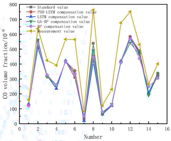 From Figure 6, it can be seen that the measured values of electrochemical carbon monoxide sensors are generally higher than those of the standard values recognized by flue gas analyzers, and the volume fraction between the two continues to expand with an increasing concentration. The increase in carbon monoxide concentration indicates that the fire is constantly growing, causing an increase in the environmental temperature and a decrease in environmental humidity, which is an important reason for the increased error of electrochemical carbon monoxide sensors. By comparing the compensation effects of the four algorithms, it can be seen that the overall compensation effect of the PSO-LSTM exceeds that of the other three algorithms.