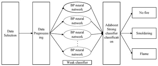 - The improved BP-AdaBoost algorithm, which uses a BP neural network as a weak classifier and AdaBoost as a strong classifier, trained the fire-detection classification model on the measured data. The training results indicate that the model could effectively distinguish and classify various typical combustibles in variable-pressure environments and has great application prospects.