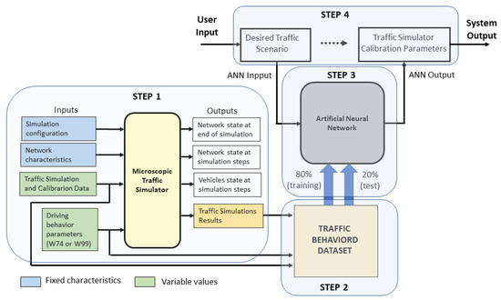 As shown in Figure 1, the method comprises four steps: (a) data generation from microsimulations, (b) data processing, (c) ANN training and testing, and (d) use of the trained ANN to obtain the traffic simulator calibration parameter.