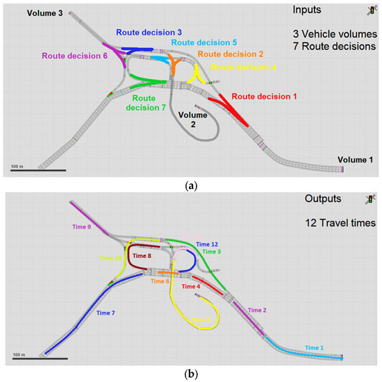 The generation of sets with different values for the vehicle flow demands and driving behavioral parameters was performed repeatedly to build a dataset of instances to be run in the microsimulator. This dataset must be sufficiently large to cover a range of values for calibrating variables. The following section presents simulations performed to obtain the corresponding output data regarding traffic performance measures, such as travel times, speeds, delays, and vehicle counts in the network links. The number of runs and the duration of each simulation depend on the characteristics of the network and its attributes.