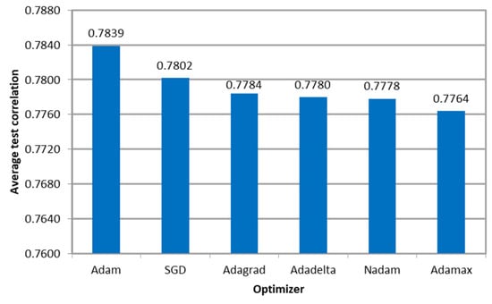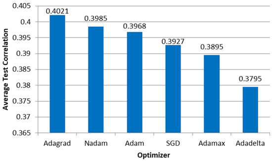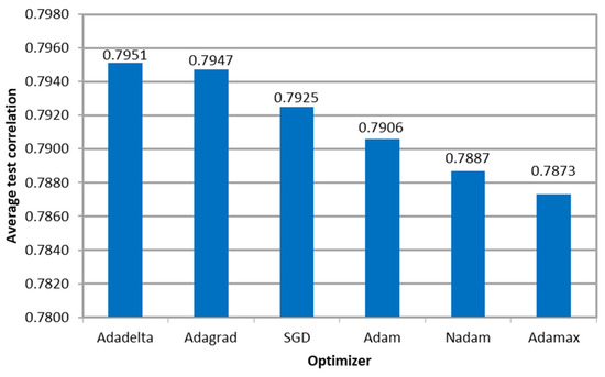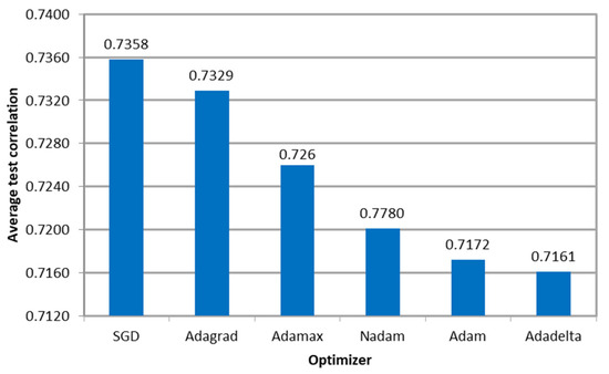 Figure 15 shows that the SDG and Adagrad require the highest number of epochs before the ANN implements the early stopping procedure at 2000 simulations, the latter significantly higher than the former. In contrast, Figure 16 shows that the average correlation between the microsimulation inputs and the ANN outputs varies between 0.4071 and 0.3795, indicating that the ANN cannot provide accurate values for these kinds of parameters.
