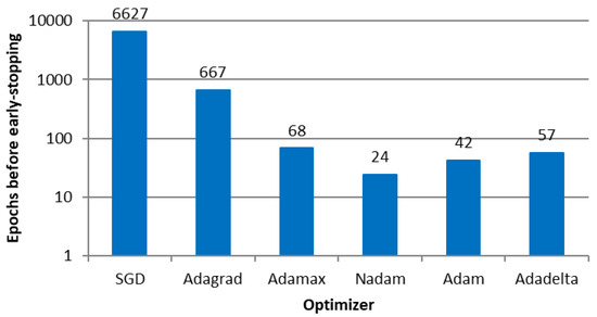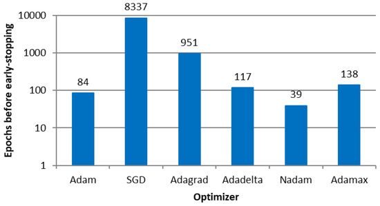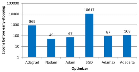 The number of epochs must be defined to avoid ANN underfitting and overfitting and to minimize the training error. The Keras environment implements an early stopping procedure, and several training algorithms are comparable regarding the epoch number required for training each neural network. Therefore, this study estimates an adequate number of epochs per optimizing algorithm in each experiment.