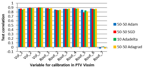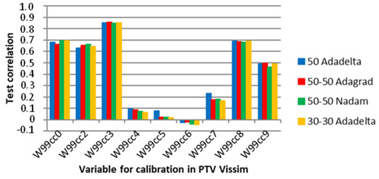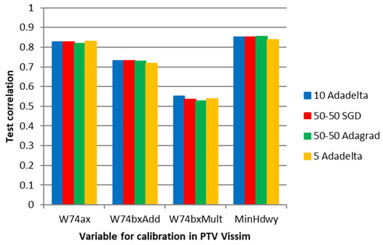 Furthermore, Figure 13 shows that the average correlation between the microsimulation inputs and ANN outputs varied between 0.7358 (SDG) and 0.7161 (Adadelta). These values are lower than the ones obtained in previous experiments (E1 and E2), as we are not calibrating physical parameters, such as volumes and route decisions, but psychophysical parameters, which are related to the Wiedemann 74 Model (W74).