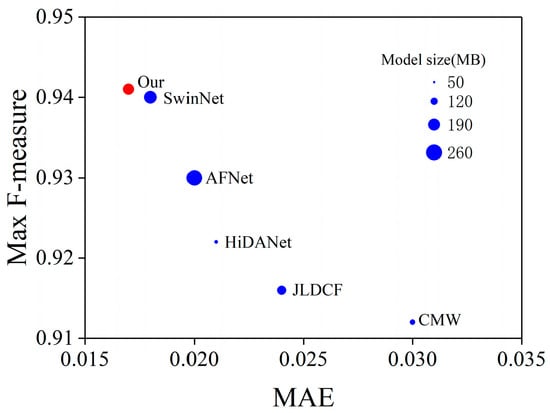Figure 1. Max F-measure, MAE, and model size of different methods on the NLPR dataset. Our model achieves better performance with a smaller model size.