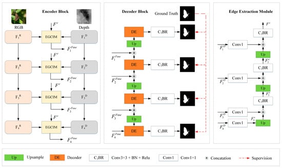 - A newly designed edge-guided cross-modal interaction was employed to effectively integrate cross-modal features, where the depth enhancement module was employed to enhance the depth feature and the cross-modal interaction module was employed to encourage cross-modal interaction from global and local aspects.