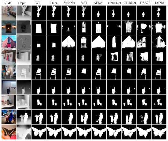 We implemented our model on PyTorch with one NVIDIA A4000 GPU. The Swin Transformer that has been pretrained on ImageNet was employed as our backbone network. The parameters of the Swin-B model were initialized with the pretrained parameters, and the remaining parameters were initialized with PyTorch default settings. The Adam optimizer was employed to train the proposed model with a batch size of 5, a momentum of 0.9, and a weight decay of 0.1. The initial learning rate was 1 × 10−4, which was then divided by 10 for every 60 epochs. All images were resized to 384 × 384 for training and testing. The single-channel depth image was replicated to a three-channel image, which was the same as the RGB image. Data augment strategies, including random flipping, rotating, and border clipping, were employed to augment the training data. The model was trained for 120 epochs.