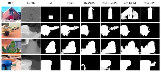 Effectiveness of DEM in EGCIM: To verify the effectiveness of DEM in EGCIM, we removed DEM from our full model. In Table 2, we quantitatively demonstrate the contribution of DEM. As shown in Table 2, the depth enhancement module improved the performance of the proposed model, especially on the LFSD dataset. The MAE, S-measure, F-measure, and E-measure are improved by about 0.012, 0.018, 0.013, and 0.009 in the LFSD dataset, respectively.