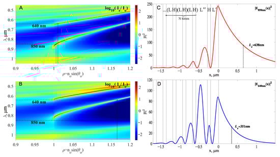 It can be seen that this 1D PC is designed so that both modes at nm have an excitation angle very close to the TIR angle, and hence, the effective RI is close to unity (). As a consequence, the penetration lengths of their intensities into the vacuum are very long (see in Figure 2C,D and in Table 1).
