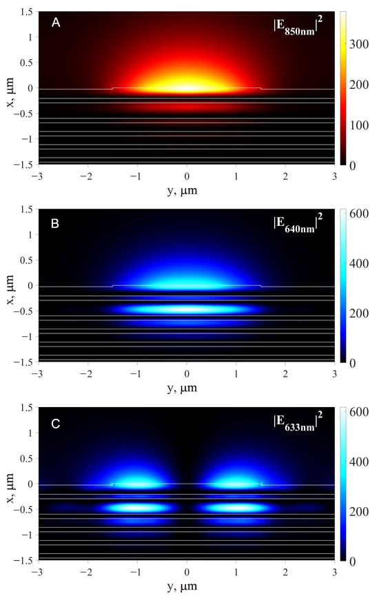 One possible way to mitigate this limitation is to use a freely suspended thin dielectric film [,] to achieve . With this approach, the following penetration length values for the intensity of evanescent waves were obtained []: nm and 69.75 nm for modes excited in a 300 nm thick suspended silica film with waveguide rib height nm and width m (at wavelengths nm and 720 nm, respectively).