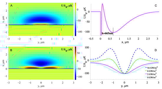 In Figure 4C, a vertical cross-section of the potential well at is shown. The minimum of the well is at nm from the surface. This should provide a very stable confinement of atoms at large distances from the dielectric surface, where the influence of the van der Waals force is negligible. The light intensities (see Table 2) are chosen so that the trap depth is 100 K. The sum of all light intensities gives the total atomic light scattering rate at the center of the trap, Hz by Equation (4).