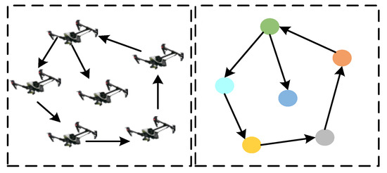 In the applied multi-UAV leader–follower model, the individual UAVs are considered as vertices of the graph, and the presence or absence of edges represents the existence of an information exchange between the UAVs. For a particular UAV, if the neighbors appear within the communication acceptance range of itself, the corresponding edges will be generated in the graph. In this paper, two communication topology networks will exist, including the one which contains the members of the pursuit multi-UAV cluster and the other which contains the members of cluster and the target.