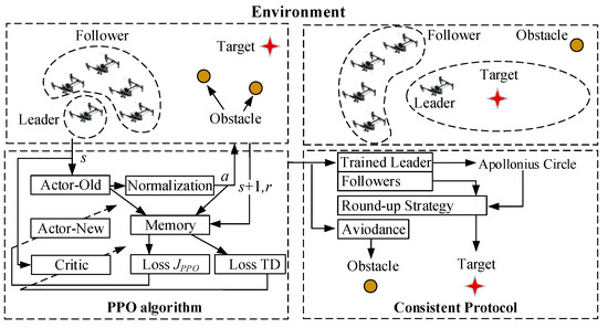 The traditional formation control method for a multi-UAV cluster generally requires leaders follow a previously prescribed flight path, which may lead to the failure of target tracking and obstacle avoidance when faced with a complex environment. Specifically, when based on the consistency protocol only, the round-up mission will fail if the pursuit multi-UAV cluster cannot detect the target, or if the round-up route is interrupted by an obstacle. To deal with this problem, this paper designs a consistent round-up algorithm based on PPO path optimization for the leader–follower [31] tracking problem, as shown in Figure 3.
