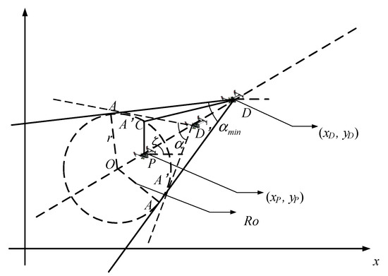 The diagram of an Apollonian circle is drawn in Figure 4. Suppose that point P is the position of a pursuit UAV and its velocity is , and point D is the position of the target and its velocity is ; then the ratio is expressed as follows: