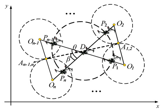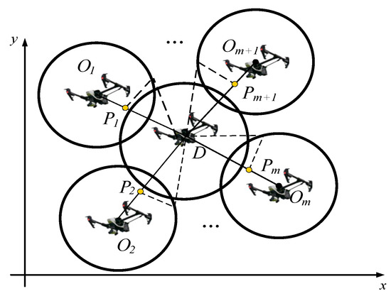 Uses D to represent the target to be rounded up and to represent the center of the Apollonian circle formed by the ith pursuit UAV and the target. The details of the formed Apollonian circle can be obtained based on Equations (20)–(23). In order to round up the target, it is necessary to design the desired position for each pursuit UAV. In this way, when the pursuit UAV can detect the target, it will continuously fly towards , thus completing the round-up for the target. The final formation of the round-up condition is shown in Figure 6.
