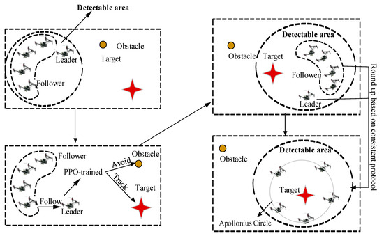 The whole process is shown in Figure 7, where we use a circle to express the obstacle and a star to represent the target. It is seen that for situations in which the leader is able to reach the detectable area of the target, the target can be rounded up based on the round-up route and consistency protocol provided in Section 3.1 and Section 3.2. However, when facing a complex environment in which the leader is unable to directly reach the detectable area of the target, or where certain obstacles exist, it is necessary to plan an optimal flight path for the leader. The optimization process is conducted based on the PPO algorithm. By using such a reinforcement learning method, the leader can be guided to reach the detectable area in an optimized way, thereby further completing the encirclement of the target by other followers.