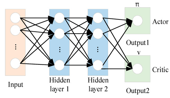 The PPO algorithm consists of two types of networks, including the actor network and the critic network. With input which contains the states of the leader, the target, and the obstacle, the actor networks can generate the corresponding policies and the corresponding actions, and the critic network generates the state value function. The whole diagram of the actor network and the critic network can be shown in Figure 8.