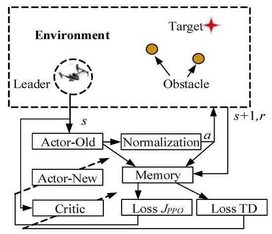 The network’s PPO update process is shown in Figure 9. The first step is to initialize the conditions of the target, leader, and obstacle, where their position and speed are randomly generated within a certain range. Then, the relative state can be calculated and inputted into the PPO algorithm. Based on the policy network, the leader’s action will be outputted and executed to the environment. After the interaction, the next state and the reward can be obtained. To repeat the above steps, the trace can be obtained and then stored in the memory.
