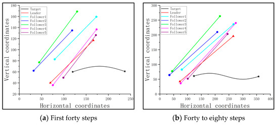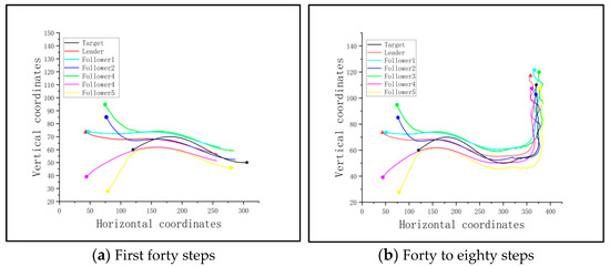 After the introduction of the trained leader, the followers should follow the path of the leader to track the target and avoid the obstacle. Once the cluster can detect the target, the target will be rounded up, based on the consistency protocol. The corresponding traces are shown in Figure 23, where the gray range represents the impact range of the obstacle.