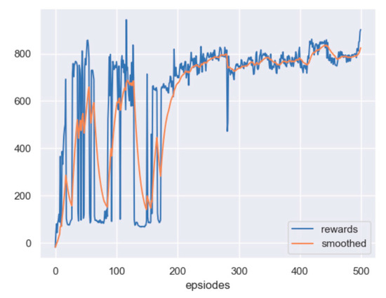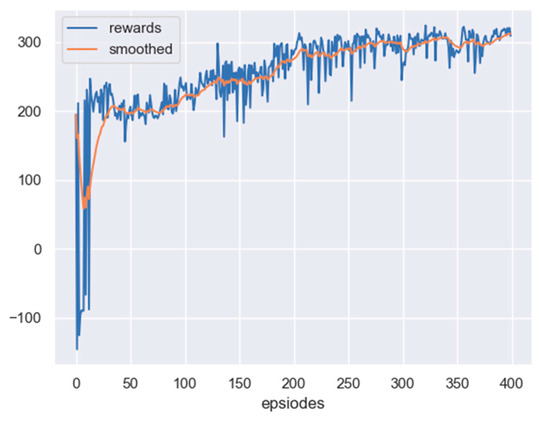 Based on the PPO algorithm, after 500 episodes of training, the reward curve of the leader converges, which means that the leader can reach the detectable area of the target. The corresponding reward curve is shown in Figure 17.