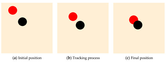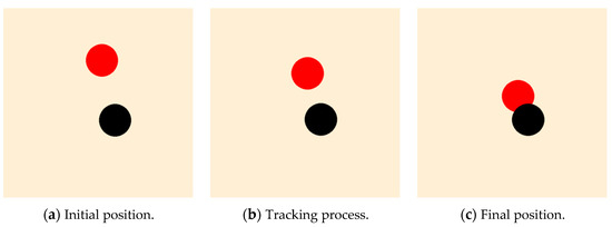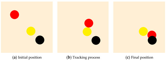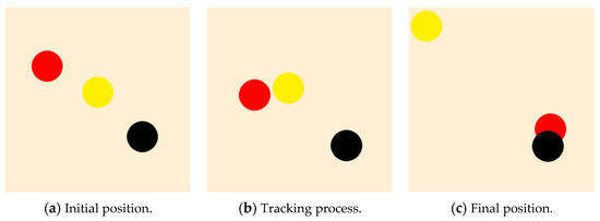From Figure 18, it is observed that the leader can approach the target and avoid the obstacle after being trained, and the converged reward is about 800 scores, which is higher than that in Figure 12 and Figure 15 because of the extra bonus earned by obstacle avoidance. The display after training is shown in Figure 19, where the red circle is the leader, the black circle is the target, and the yellow circle is the obstacle. It can be seen that the leader can avoid the impact range of the obstacle by reaching the detectable range of the target after the training.