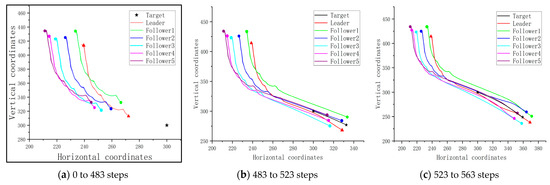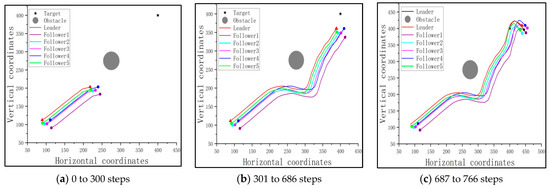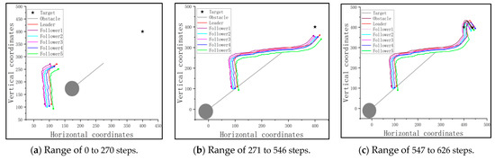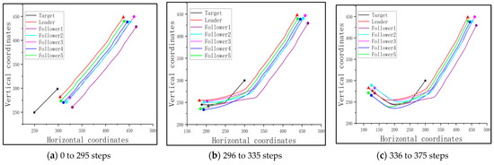 The traces of the leader, followers, and the target are shown in Figure 20, where the gray range represents the impact range of the obstacle.