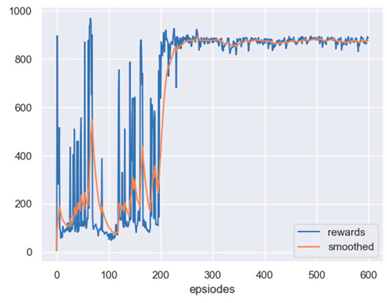 From Figure 21, it can be seen that the reward curve converges after 600 times of training, and the leader is expected to reach the detectable area of the target while simultaneously avoiding the obstacle. A diagram of the leader, target, and the moving obstacle after training can be seen in Figure 22.
