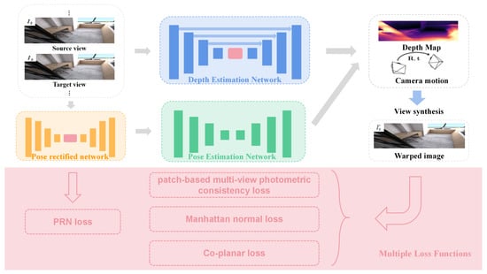 We adopt multiple loss functions [19,20,22,24] as the final loss function to address the issues of non-textured regions and camera pose. The loss function consists of image patch-based photometric consistency loss, Manhattan normal loss, co-planar loss, PRN loss, and edge-aware smoothness loss. The following sections will provide detailed descriptions of each component.