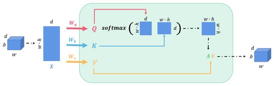 Structure of the multi-head self-attention (MHSA). The input tensor is transformed into the corresponding query (Q), key (K), and value (V), and then fed into the MHSA for learning. A is computed from Q and K.
