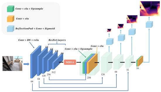 Structure of Depth Estimation Network. The input is an RGB image, and the output is four depth maps of different scales. The network is an encoder–decoder architecture with skip connections, and a multi-head self-attention module (MHSA) is inserted in the middle to improve the accuracy of the depth estimation.