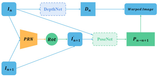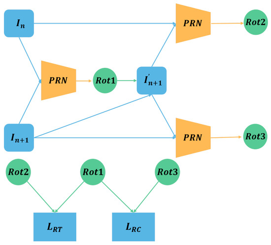 According to the theory and method in SC_Depthv2 [22], which was introduced in Section 2.3, we propose the PRN loss as shown in Figure 7. We use the PRN to generate the image that removes the rotational motion from the adjacent frame images and . In theory, there is no rotational motion between and . That is, the should be 0 after applying another PRN to and . Moreover, the obtained by and should be equal to the obtained in the first step. The structure of the PRN loss is shown in Figure 7. Therefore, we establish the PRN loss as follows: