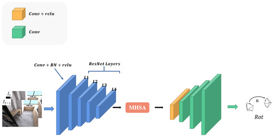 Structure of the proposed Pose Rectified Network (PRN). The input is two adjacent frames, and the output is the relative rotational motion between them. The network is an encoder–decoder architecture with a multi-head self-attention module (MHSA) in the middle.