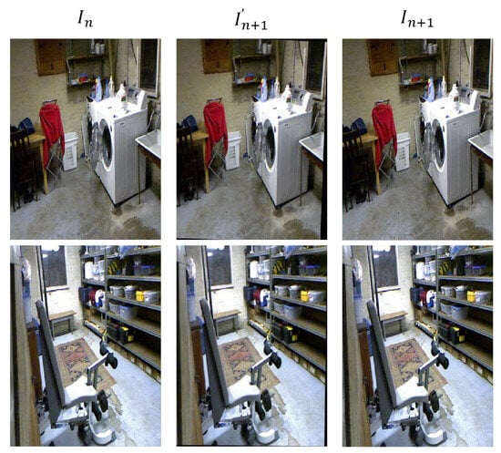 The pose rectified network (PRN) has a similar structure to the pose estimation network, a simple encoder–decoder network, employed in SC_Depthv2 [22], but we improve the structure design of it. To improve the model performance and address the challenges of long-distance dependency and global correlation modeling in image processing, we integrate multi-head self-attention modules (MHSA) into the encoder–decoder architecture. Figure 5 illustrates the structure of the pose rectified network. The output is the camera rotation rather than the six degrees of freedom pose. Moreover, to clearly show the effect of rotation removal, we visualize the images of consecutive frames after removing the rotation. Figure 6 shows the visualization of the PRN warped results.