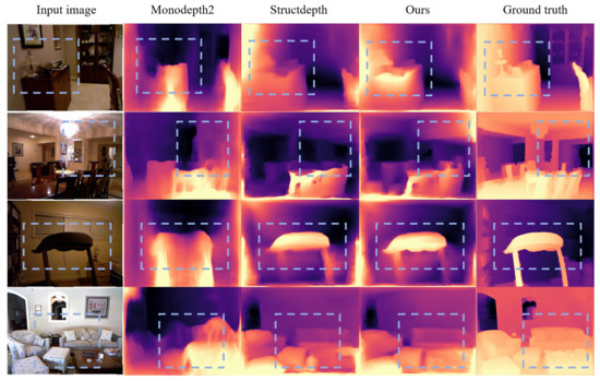 To demonstrate the effectiveness of our proposed method, we make the visualization shown in Figure 8. We compare different models on the NYUv2 [23] dataset, including the classical network models Monodepth2 [17], Structdepth [20], our model, and we also add the ground truth images as references to better show the validity of our model. Figure 8 shows that our model achieves higher accuracy, especially in the regions marked by the blue dashed boxes. For instance, in the first row, our model can better estimate the contours of the cabinet and the objects on it, while the other two methods perform poorly; for the second row, our model has a clearer estimation of the ceiling and wall, while with the other methods, it is hard to distinguish the estimated results; similarly, for the third row, our method has a very clear contour estimation of the object shown in the image, which is very close to the ground truth; likewise, for the fourth row, our model can better capture the details of the furniture, such as the sofa, table, etc., as indicated by the blue dashed boxes. Thus, it can be seen that our method has a significant improvement over the previous methods and achieves a good effect.