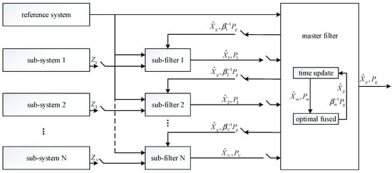 The federated filter is composed of multiple sub-filters and a master filter. The sub-filters process the data in parallel. The state estimates of them are acquired by their measurements, respectively; the state estimates and the estimated covariance matrix are transmitted to the master filter as the input information. The master filter outputs the optimal solution of the state estimates and the covariance matrix after the optimal fusion of the sub-filter data. Meanwhile, the state estimates and covariance matrix of each sub-filter are reset by the obtained optimal result; is the information allocation coefficient [23]. The federated filter mainly fuses the estimated values and variances transmitted by the sub-filters, which is essentially a weighted average.