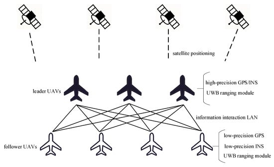 Aiming at the cooperative positioning problem of a multi-UAV, this paper designs a cooperative positioning scheme of follower UAVs following leader UAVs. In this scheme, a small number of UAVs are equipped with high-precision GPS/INS integrated navigation equipment, and these UAVs are defined as the leader UAVs. The remaining UAVs are defined as the follower UAVs, which are equipped with low-precision GPS and INS navigation equipment. In addition, all follower UAVs and leader UAVs are equipped with ranging equipment. Based on the advantages of the UWB ranging module, such as strong anti-interference ability, fast data transmission speed and accurate ranging [24], this paper selects the UWB ranging module as the ranging equipment. The cooperative positioning scheme is shown in Figure 2.