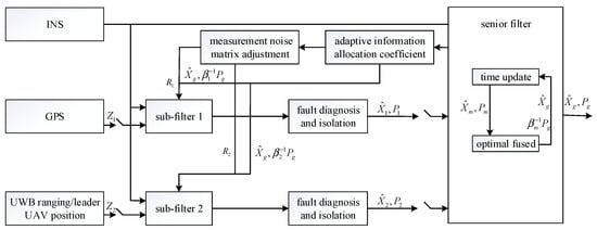 Based on the model established above, in order to reduce the influence of faults on global estimation and improve the robustness of the cooperative positioning system, an adaptive fault-tolerant federated filter, shown in Figure 3, is designed.