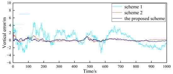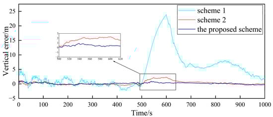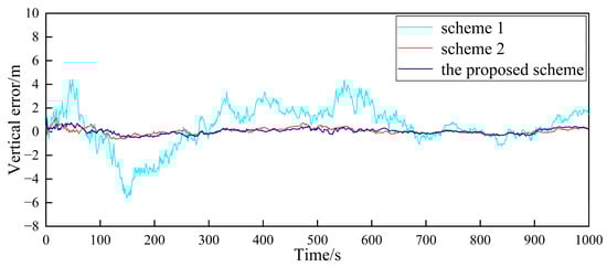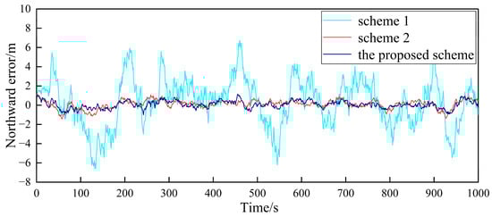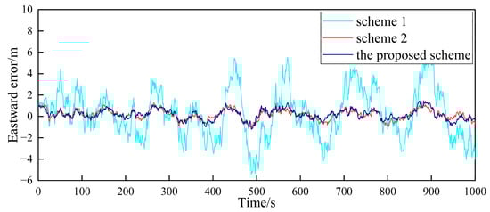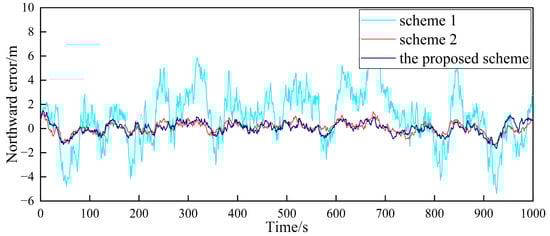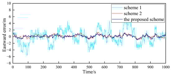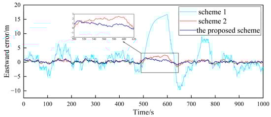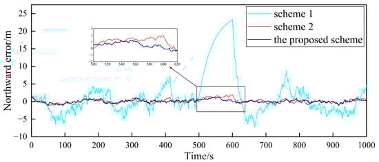 Figure 10, Figure 11 and Figure 12, respectively, show the comparison of the positioning errors of two different schemes when the gradual fault occurs. It is shown that when the gradual fault occurs, the positioning accuracy and fault tolerance of Scheme 1 are very poor in the three directions, while Scheme 2 and the proposed scheme in this paper have a good fault tolerance, but the error of the proposed scheme in the data abnormal time period of 500–600 s is lower than that of Scheme 2. In order to quantitatively analyze the fault tolerance performance of Scheme 2 and the proposed scheme in this paper, the RMSE and mean are counted, as shown in Table 3.