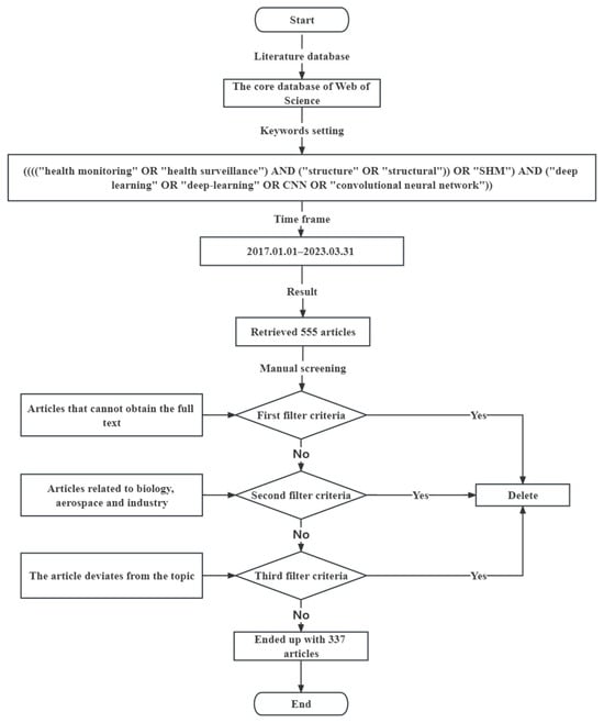 - Time frame: To study the latest progress of SHM, we selected the relevant literature in the past six years, and the corresponding search time range was 1 January 2017–31 March 2023..