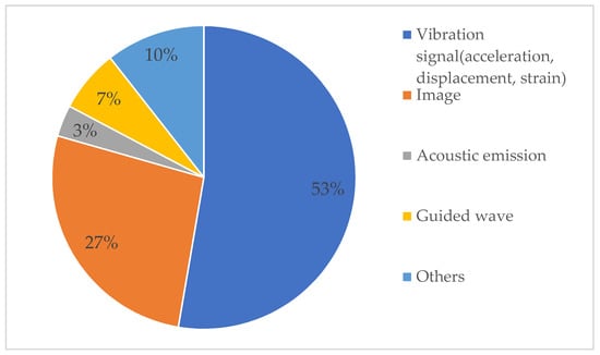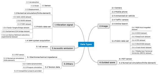 - The data and collection methods of DL applied in SHM are analyzed statistically. The application scope and advantages and disadvantages of different data types are further analyzed on this basis. Secondly, various data acquisition methods are compared based on time consumption, cost, and data acquisition accuracy. In terms of data, vibration signals, images, acoustic emission signals, and GW signals are the most common data types, of which vibration signals account for the highest proportion of research, suitable for detecting various damage. Sensors and cameras are the most direct and commonly used tools for data acquisition. In addition, the rapid development of drones and smartphones have also become popular image acquisition tools.