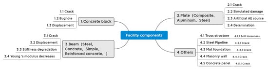 - The application object and function of DL in SHM are analyzed statistically. This paper divides the application objects into two categories: facilities and facilities components. Facilities include bridges, frame structures, buildings, etc., and facilities components include concrete blocks, metal plates, beams, etc. Among them, the research on bridges accounts for the highest proportion. Regarding application function, the most common injuries reported in the literature include cracks, stiffness reduction, bolt loosening, support damage, and simulated damage. In addition, data loss and anomalies are also becoming a concern for researchers. The research stage can be divided into the experimental and practical application stages. Only some literature selects research objects and data from actual structures, mainly bridge databases such as Yonghe Bridge in Tianjin, Saigon Bridge in Vietnam, and bridge inspection records in South Korea.