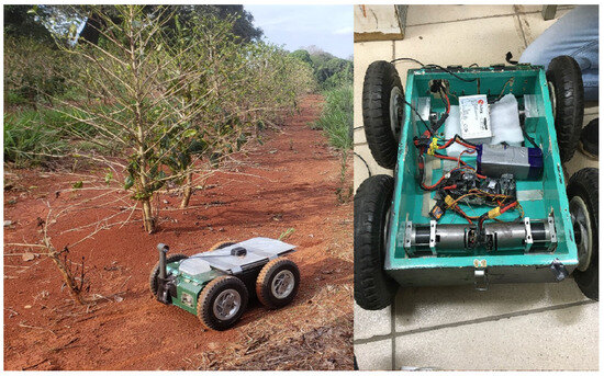 The test was conducted in an experimental coffee plantation composed of young coffee trees with a height of about 1.5 m located at the Federal University of Lavras (UFLA). The rover (Figure 1) was guided through the corridors of the coffee plantation, which are approximately 130 m long, (The planned and executed path is illustrated in Figure 2) collecting and saving, in a personal computer, GPS raw data at a tracking interval of 1 s so that the data could be post-processed (aiming at the rover’s position computation) using the following two algorithms developed in the Matlab® environment: