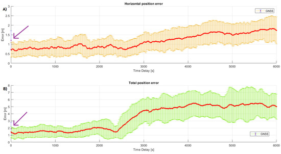 Mean error of horizontal (A) and total (B) position as function of communication failure. The first plotted data refer to the position estimation performed by the SGNSS algorithm (highlighted by the arrow in purple), and the remaining data (red dots) refer to the RGNSS algorithm.