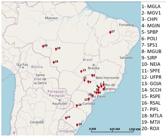 The same GNSS dataset collected in the coffee plantation test was used, and the rover position was again estimated by using the SGNSS and RGNSS approaches. For the latter, 20 RBMC bases were selected to be the reference stations, which provided raw pseudorange measurements for the rover so that the common mode errors could be canceled out during its position estimation process. The reference stations were selected according to their baseline separations from the coffee plantation located at UFLA so that the distances gradually increased in the range from 1 km to 2150 km. Since this was a dynamic test with a moving agricultural rover, the distance between the rover and the reference station was defined using the home point of the experiment (highlighted by the red circle in Figure 2). The chosen bases were MGLA, MGV1, CHPI, MGIN, SPBP, POLI, SPS1, MGUB, SJRP, NEIA, SPFE, UFPR, GOJA, SCCH, RSPE, RSAL, PIFL, MTLA, MTJI, and ROJI, which are displayed in Figure 4. During the experiment, the rover’s trajectory was defined as being toward the MGLA station so that the greatest distance between the latter and the rover for this specific situation was 1 km (rover at the home point).