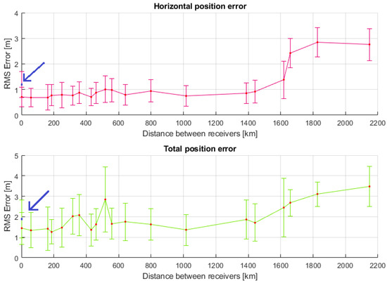 Horizontal position error as function of baseline separation for the RGNSS approach. For a distance of 0 km, the plotted data refer to the position estimation performed by the SGNSS algorithm (highlighted by the arrow in blue).