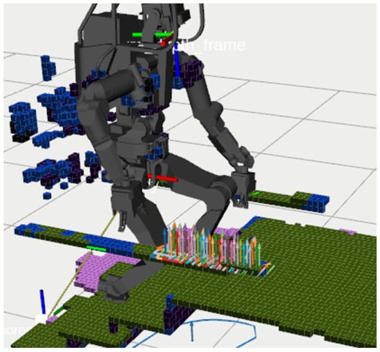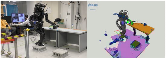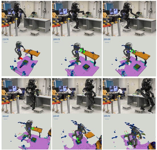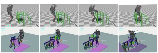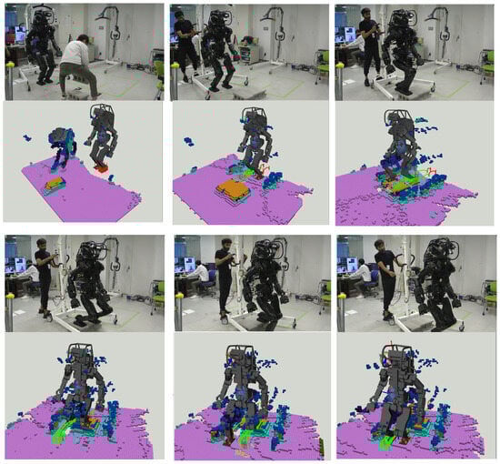 Figure 18 illustrates the HRP5P successfully navigating a pathway obstructed by concrete blocks. Initially endowed with a reference motion predicated on a cyclic bipedal walking pattern with 25.0-cm steps, the robot was expected to dynamically adapt to the changing environment. During the active phase of the system, an individual placed blocks in the robot’s path, thereby altering the previously flat environment and generating additional voxels from the person’s movements. Regardless, the ray-casting function effectively removed the unnecessary voxels, which enabled our planner to delineate suitable collision-free trajectories for the robot limbs. Throughout the experiment, the replanning function was triggered for 12 instances, with the computational time averaging at 23.5 ms, varying from 19.2 ms to 27.3 ms. Notably, the segment requiring the most extensive computation time involved strategizing the left foot’s elevation to surmount a block.