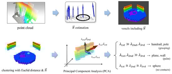 6] (ver.0.20.20), an open source 3D-SLAM software for camera’s self localization are used. The resolution of the voxels is set at 3 cm. The entire area measures approximately 8.0 m × 10.0 m, featuring 959,475 voxels, which corresponds to 237.6 MB of data. For visualization purposes, we randomly change the colors for each segmented instance. The small arrows indicate the estimated normal vector of each cluster. In this demonstration, the voxel segmentation process averages around 322 ms in duration.