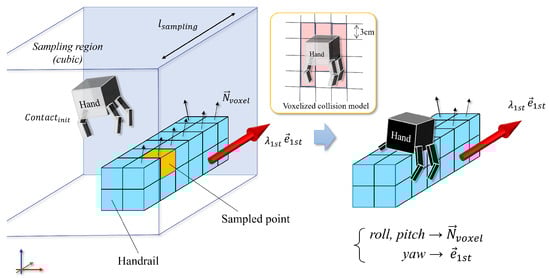 In cases of grasping handrails, the roll and pitch angles are aligned with the normal vector, whereas the yaw angle conforms to the eigenvector inherent to the voxel. Conversely, actions such as feet landing or a palm pushing against a flat plane grant one degree of freedom in the yaw axis, thereby yielding multiple candidate orientations generated at defined intervals.