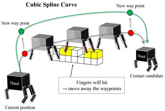 Initially, we establish two waypoints: a waypoint above the current contact point representing the starting position and another waypoint above the designated target contact point denoting the goal position. Subsequently, the planner draws a cubic spline curve and examines the trajectory at discretized intervals to identify any environmental collisions.
