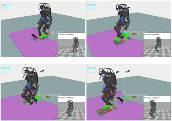 Figure 16 illustrates HRP5P navigating over a minor obstacle. Initially, the motion data stipulated flat, bipedal walking with a stride length of 25.0 cm. Regardless, the vision and replanning system discerned an obstacle in line with the original plan. To counteract this obstacle, it autonomously crafts swing trajectories that situate the landing point either shortly before the obstacle or facilitate a detour around it. The system invoked the replanning mechanism over a total of 17 iterations, with operations lasting an average of 24.5 ms; the durations spanned between 13.8 ms and 90.8 ms. The most time-consuming task involved formulating the collision evasion motion for the left foot, a process illustrated in the second image of